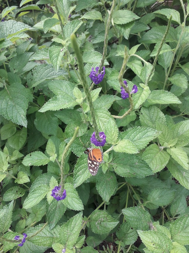 Las mariposas se acercan a besar las flores amarillas y anaranjadas de los malinchillos y las florecillas púrpura y magenta de los rabos de zorro. Al besarlas les extraen su delicioso néctar. Además desde la hamaca, en una tarde de lluvia, vimos a dos mariposas atigradas, de alas anaranjadas y negras con ribetes blancos, copular en una rama de almendro. Ni siquiera el aguacero interrumpió su encuentro íntimo. Se amaron por horas.