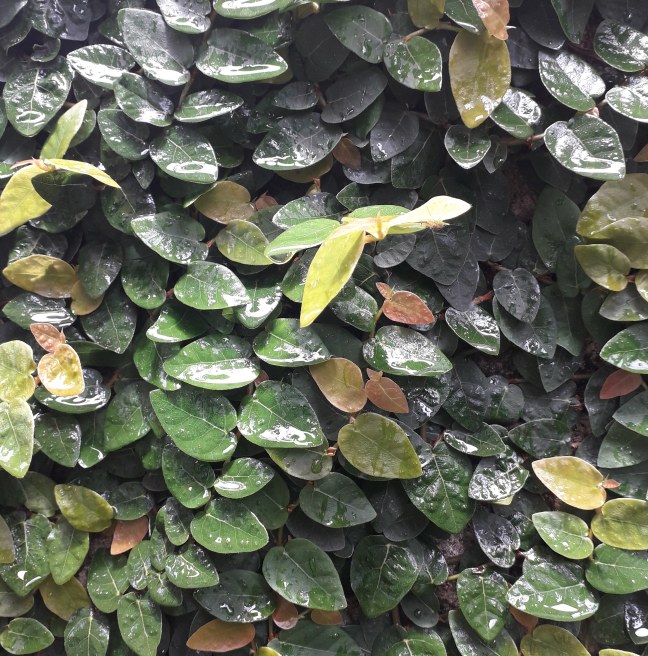 Tras la garúa, me serena la simplicidad de las hojas mojadas de la enredadera que brillan bajo la luz del sol. Su frescor reluciente ilumina mi espíritu. Mi corazón se aquieta para escuchar el gotear del agua por la cascada de hojas.