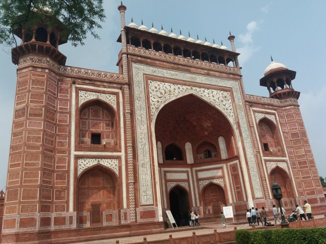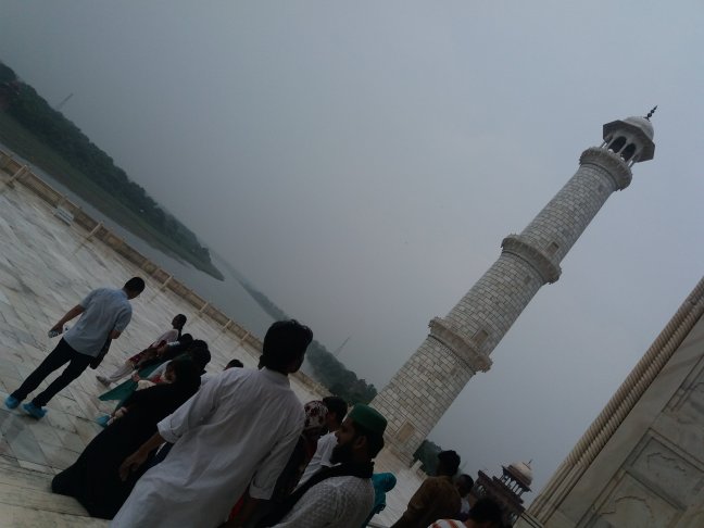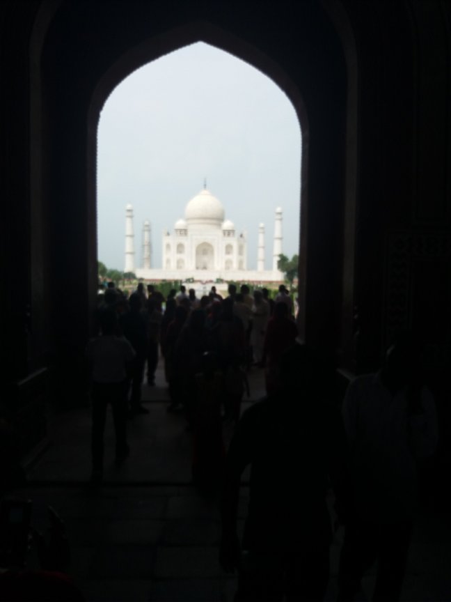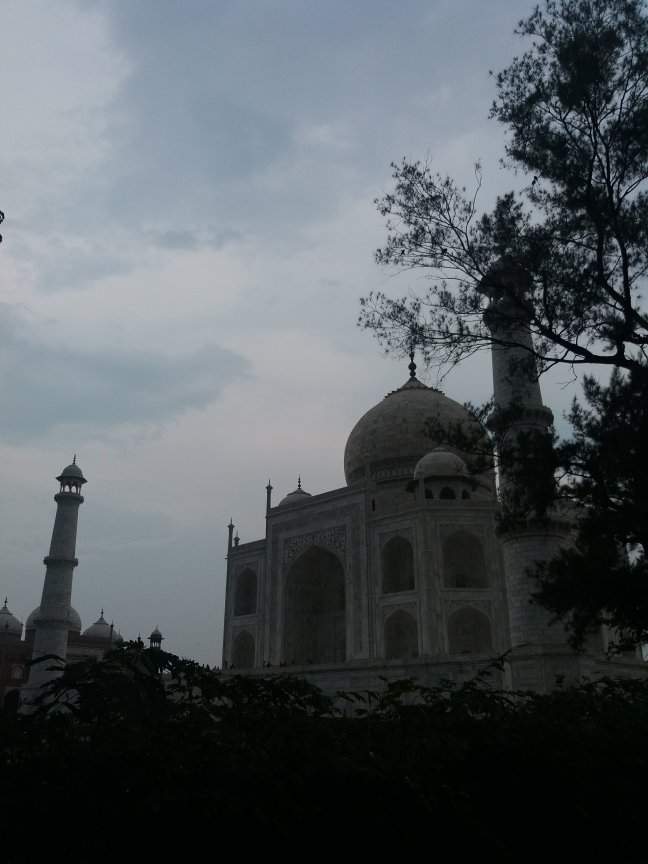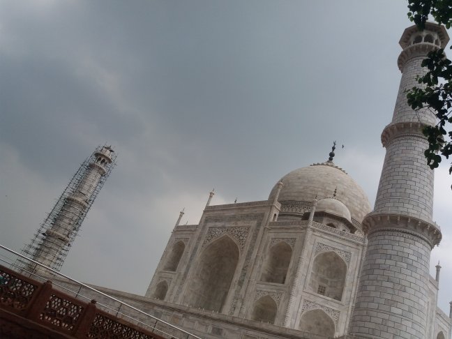 Sentimos el viento arreciar, miramos al horizonte más allá del río Yamuna y vimos las oscuras nubes de tormenta acercarse. Nos aproximamos a la maravilla arquitectónica, extasiados por su simétrica belleza, bajo un cielo ya nublado.