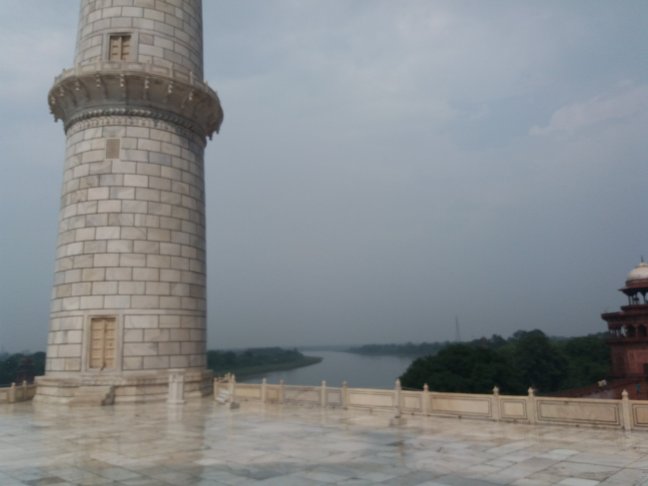 Salimos y escuchamos la gotas golpear las losas de mármol mientras observábamos la lluvia caer y bañar las riberas y el cauce del sagrado río Yamuna.