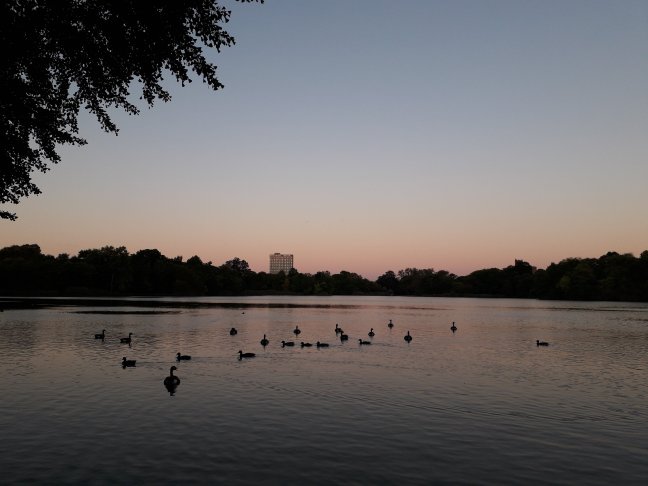 Hoy al atardecer bajé de nuevo al lago. Su superficie reflejaba los rosas y naranjas del ocaso. Cisnes, gansos y patos nadaban apaciblemente. Me hicieron compañía.