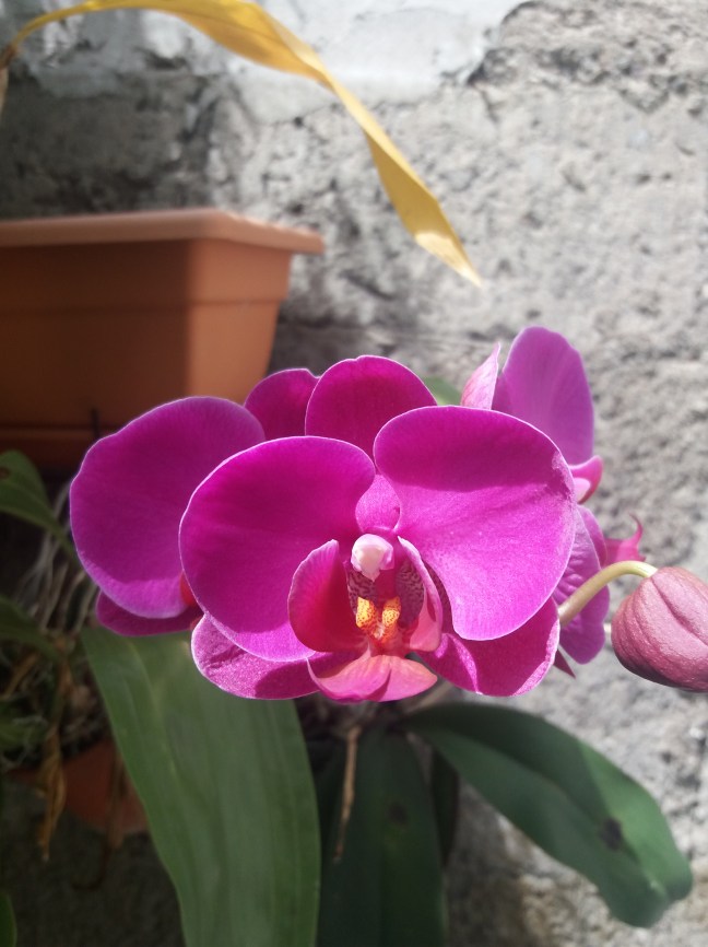 Se despejó el cielo gris de los últimos días en San José, el sol de verano volvió a brillar en todo su esplendor dorado sobre nuestro valle y sus verdes montañas y la tercera orquídea decidió abrirse en mi jardín. Esta mañana aprecié la combinación del morado de sus sépalos y pétalos, el blanco del ginostemo y el amarillo manchado de los lóbulos laterales del labelo. Noté que es un poco más pequeña que sus dos hermanas y quizá más tímida, o más cautelosa, pues se abrió un poquito menos. Le di la bienvenida y las gracias por adornar mi jardín. Ahora con paciencia, sin prisas y con respeto, espero a que se abra la cuarta flor.