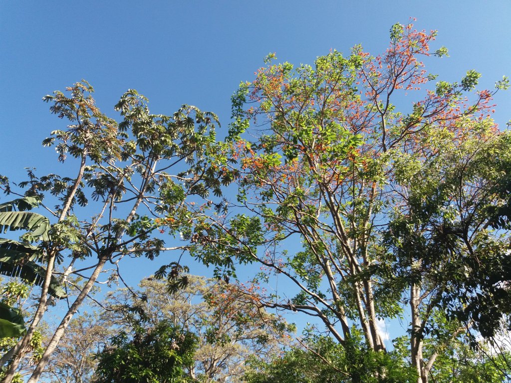 Continuamos nuestra caminata y apreciamos especies nativas de plantas y árboles. Contemplamos las flores naranja ardiente de un árbol llama del bosque y su contraste con la bóveda cerúlea.