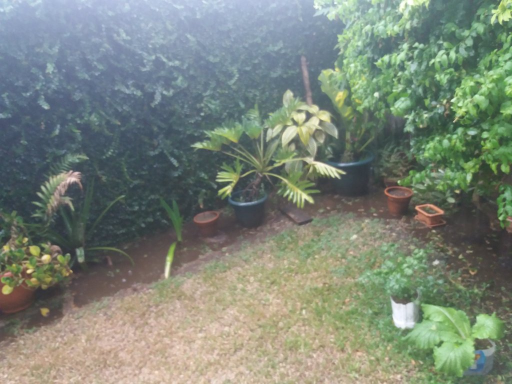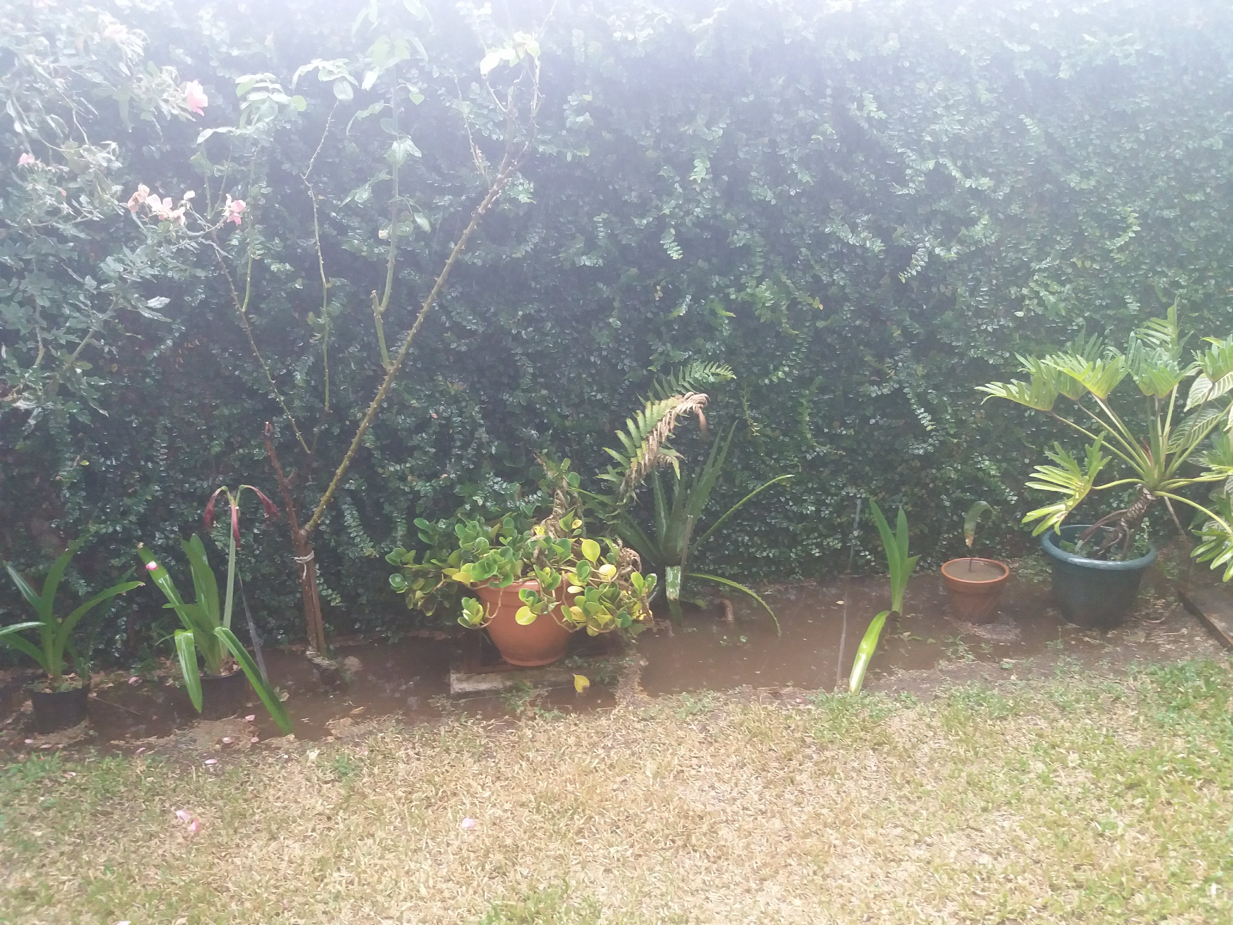 Observé a mi jardín beberse toda el agua que pudo, pero cayó tanta, que incluso la tierra sedienta se saturó y el agua se empozó. Pasaron un par de horas después del aguacero hasta que toda el agua se había filtrado hacia el subsuelo.