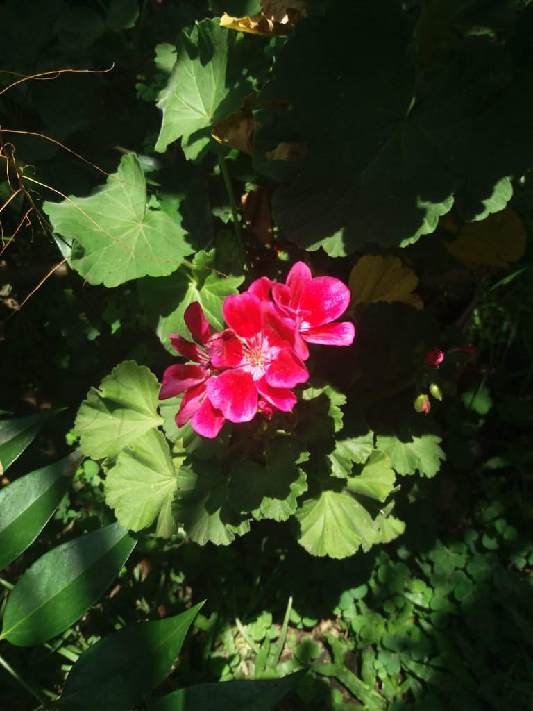 Y esta mañana salió un sol esplendoroso de abril, aún de estación seca, e hizo replandecer los verdes de las plantas y los rojos y lilas de las flores.