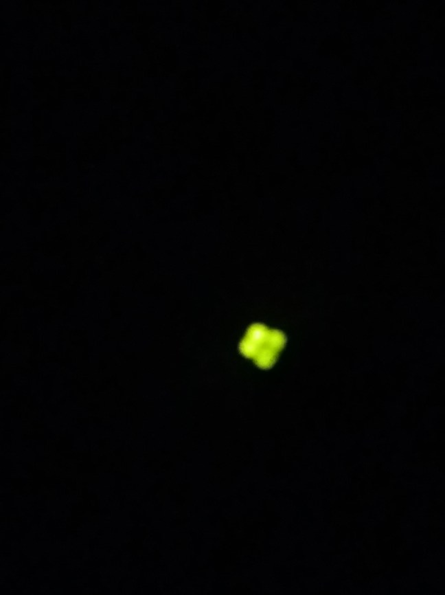 Esta madrugada entraba yo de la terraza a la casa, para cambiar el ensueño en la hamaca por el sueño en la cama, cuando vi una lucecilla verde titilando con timidez sobre una piedrita roja. No se movía. Me intrigó y la iluminé con mi foco.