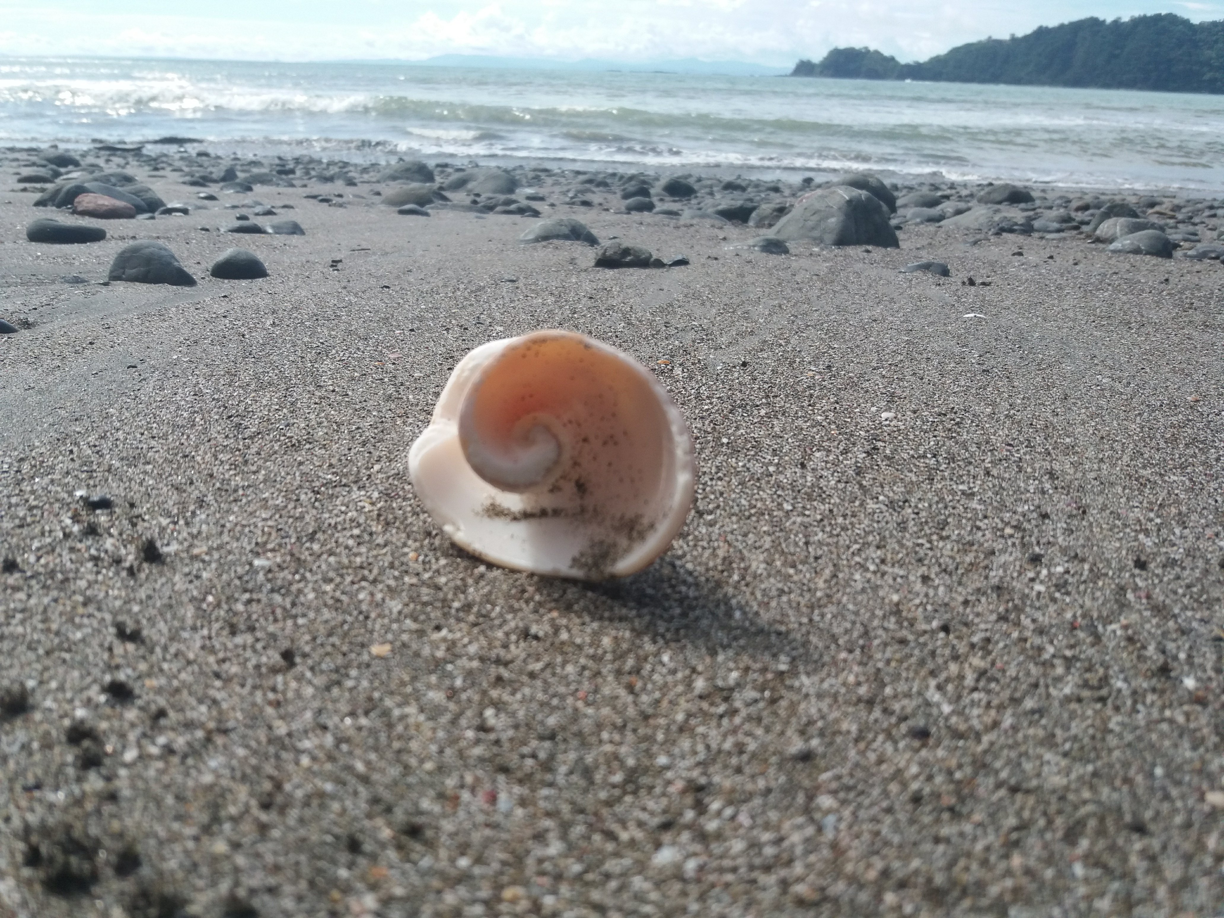 Camino de nuevo hacia el sur a lo largo de Herradura y sus playitas contiguas. Otra vez procuro el sitio donde descansan los pelícanos. Llego hasta la quebrada. Corre agua abundante pero esta vez no me adentro en el bosque. Continúo hacia la punta. Pocos pasos adelante me encuentro la concha quebrada de un gran caracol, quizá un cambute.