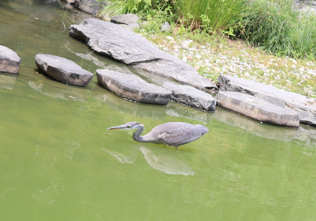 Un garzón azulado (Ardea herodias) pescaba en las aguas bajas entre el puente y la isla. Caminaba con sigilo, se detenía acechante, contraía su cuello en S y se inclinaba sobre el agua, y en el momento justo, arponeaba su presa de forma certera. Se mantenía inmersa y absorta en su pesca.