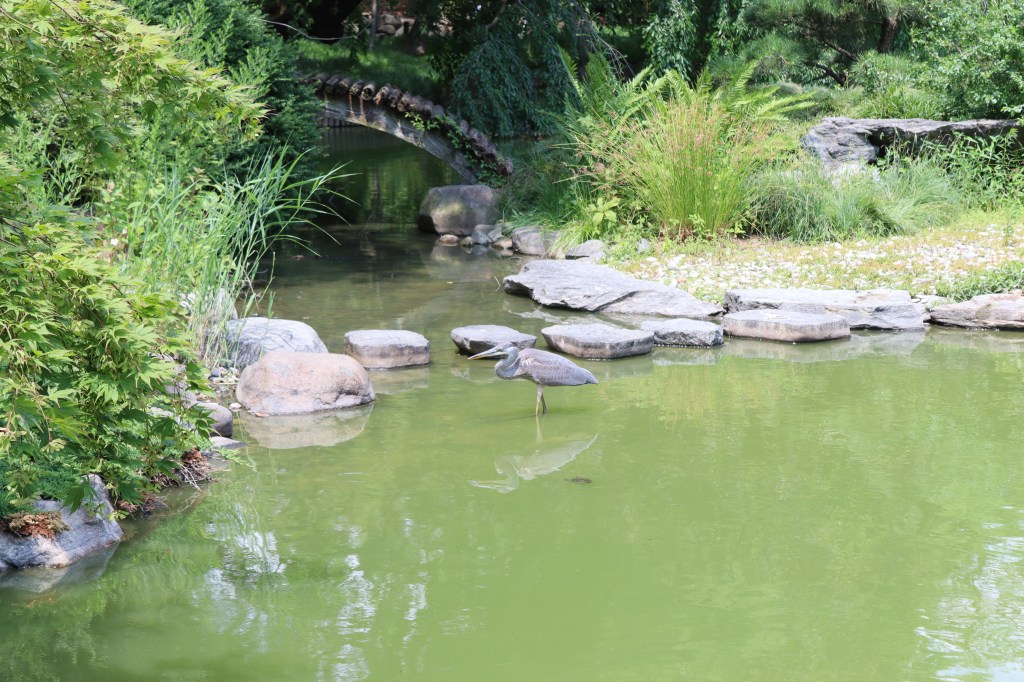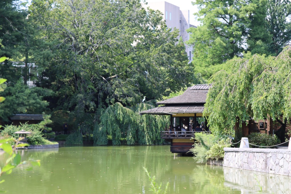 Ingresé por el portal de madera, custodiado por al farol de piedra y un cerezo retorcido, y caminé a la terraza de observación de la laguna. Observé el paisaje de colinas, coníferos, arbustos, cerezos, quebrada, laguna, isla, puentes. Saludé a las tortugas de orejas rojas y los koi (carpas) naranja y amarillo que nadaban a gusto en las aguas musgo. Contemplé al torii desde esa perspectiva. Y vi a una gran garza de alas marrón volar sobre el agua para refugiarse entre arbustos en una orilla. Me pareció que era un martinete coronado (Nyctanassa violacea).