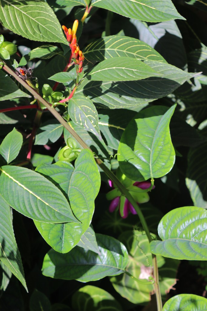 La mayoría oculto su rostro en las sombras, al amparo de las hojas del arbusto de lotería (Sanchezia parvibracteata) sobre la que se ha enredado la pasiflora. A menudo me he arrecostado en el zacate y la tierra para contemplar el bellísimo rostro de estas flores.