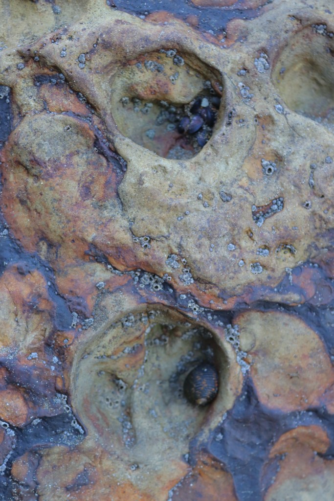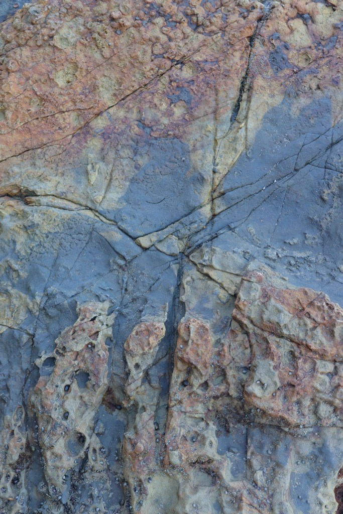 With their shy morning beauty, the rocks also summoned me to return in low tide, when the sun had dried their surfaces. So I would visit in the afternoon, when the sun had begun its descent towards the horizon line where the Pacific Ocean met the azure sky. New shapes and colors revealed themselves to the attentive, loving eye.
