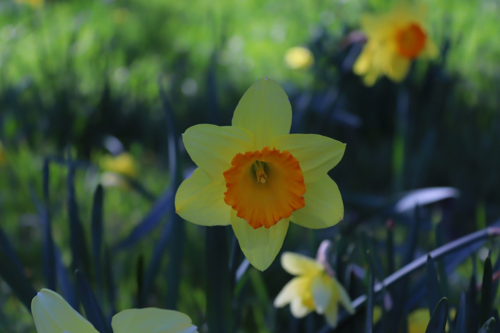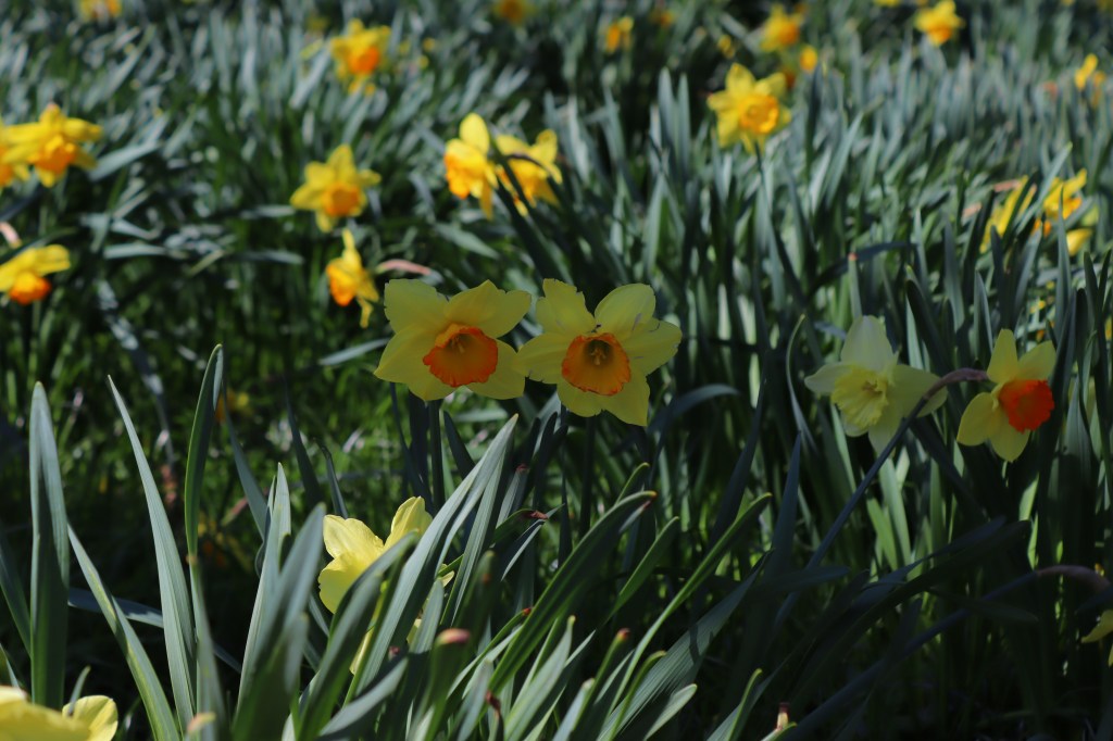 My friends and I were cutting across from the Native Flora Garden towards the Shakespeare Garden when we came upon Daffodil Hill. To our exhilaration, the hill was covered by white, yellow, and orange flowers. We walked around the hill, contemplating the trumpet daffodils in wonder.