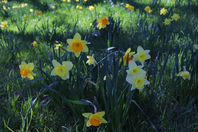 My friends and I were cutting across from the Native Flora Garden towards the Shakespeare Garden when we came upon Daffodil Hill. To our exhilaration, the hill was covered by white, yellow, and orange flowers. We walked around the hill, contemplating the trumpet daffodils in wonder.