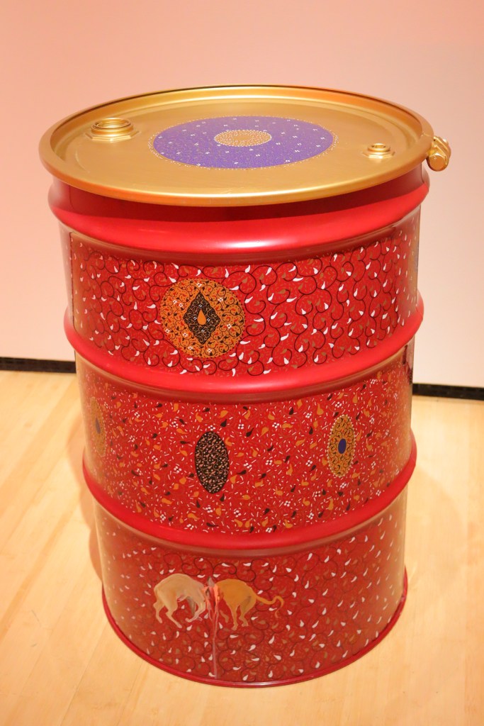 En la primera sala me encontré con el “Barril de petróleo #13” de Shiva Ahmadi, efectivamente un barril de petróleo, acero decorado con diseños tradicionales de suma delicadeza y precisión, excepto por algunos detalles de imperfección en la base del barril que evocan la violencia de los balazos y el derramamiento de un líquido: ¿Petróleo, sangre o ambos?