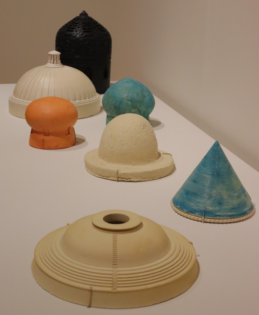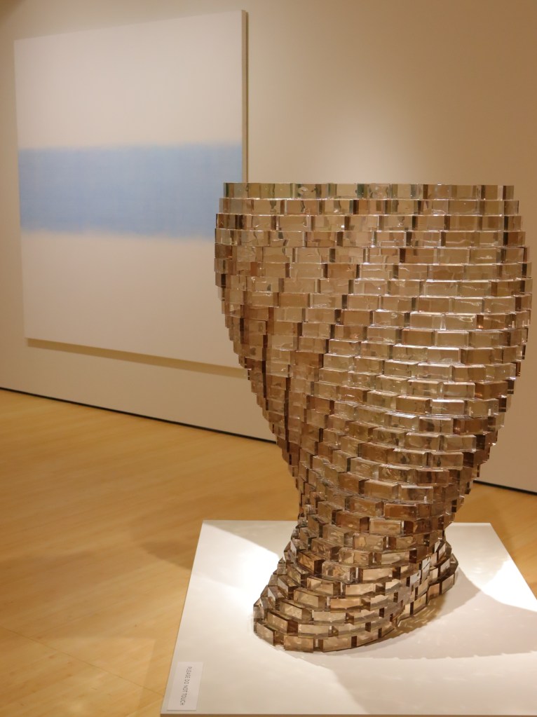 La obra de Aliabadi me preparó, además, para descubrir a Shirazeh Housiary en la siguiente sala. Allí me encontré con una escultura en forma de vórtice, construida a partir de ladrillos de vidrio traslúcido. Le dí varias vueltas, observándola desde todos los ángulos que pude, percibiendo sus aparentes cambios de forma de acuerdo con la perspectiva.