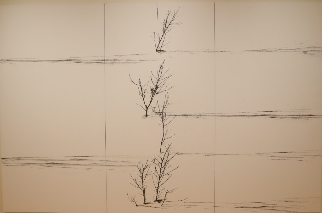 Y justo frente al lienzo blanquiazul de Housiary me encontré la mayor sorpresa de la muestra, emocionante y conmovedora para mí: un campo nevado donde destacan apenas las siluetas negras de algunos árboles sin hojas y los rastros del viento sobre la nieve.