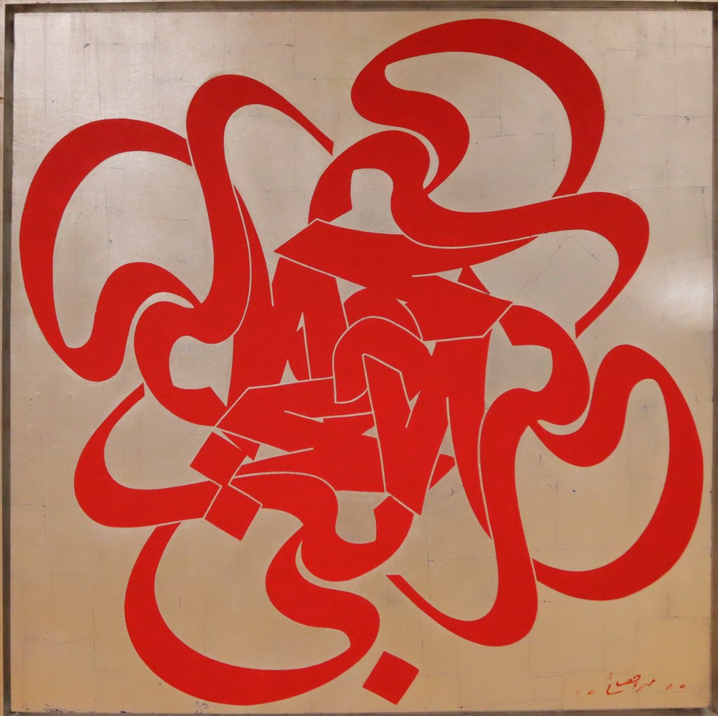 Me despedí de los árboles en el campo nevado y pasé a la última sala, donde me esperaba otro descubrimiento: una pintura caligráfica, naqashi khatt, de Mohammed Ehsai. El artista, místico y revolucionario a la vez, trazó la palabra farsi mohabbat (bondad) cuatro veces, en cuatro direcciones, con óleo rojo sobre un lienzo cubierto por lámina de plata.