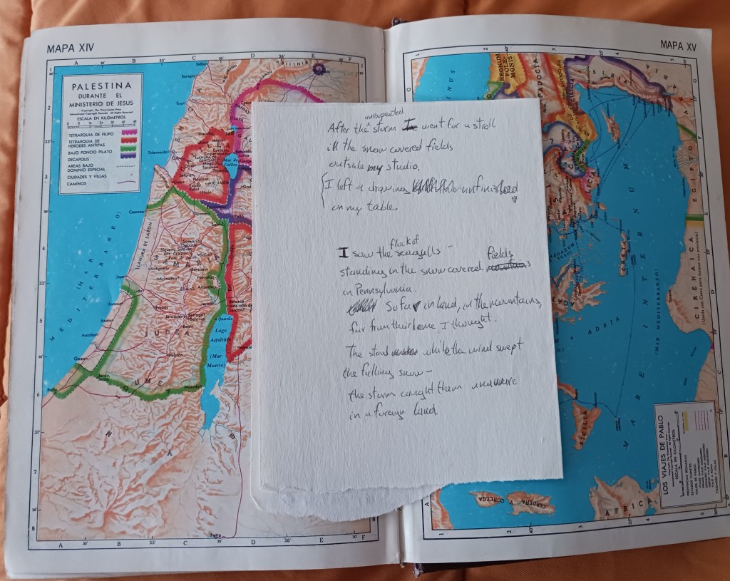 Just the other day I opened the old Bible that I used to read during my first years in Pennsylvania, and I found drafts of an unfinished poem, handwritten in pencil on a torn piece of white paper.