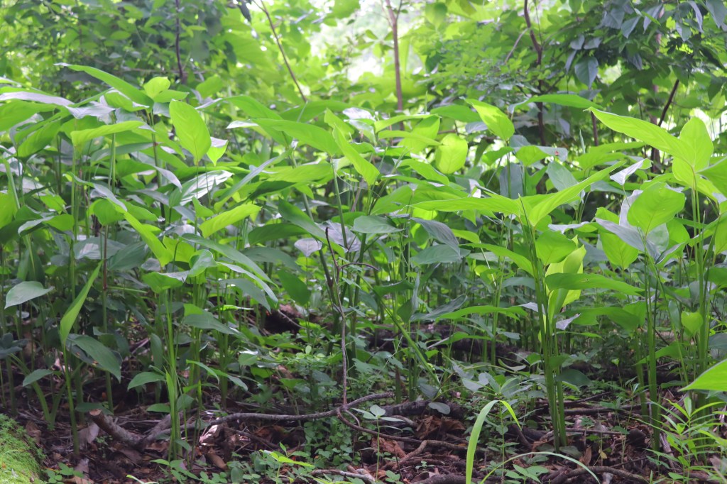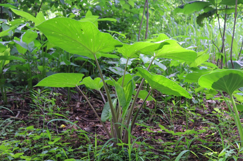 Algunas de esas plantas son de hojas anchas, en forma de corazón, y otras largas, en forma de lengua. No he logrado identificarlas, con mi guía para amadores de las plantas tropicales de este territorio, pero algunas se paracen a la bijagua (Calathea sp.).